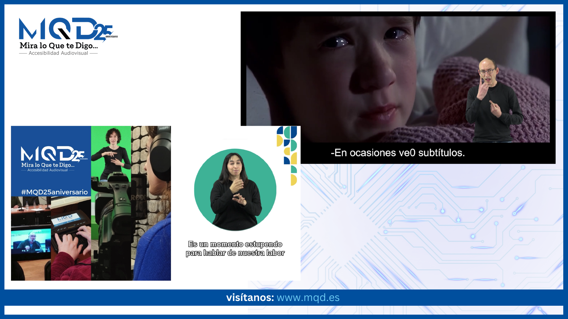 Radio Televisión Española ha confiado, de nuevo, en el trabajo de MQD y su dedicación al mundo de la accesibilidad comunicativa desde hace 25 años. El Centro Especial de Empleo burgalés lleva más de una década trabajando con el ente público y su apuesta por hacer accesibles sus contenidos para personas con distintas discapacidades sensoriales.